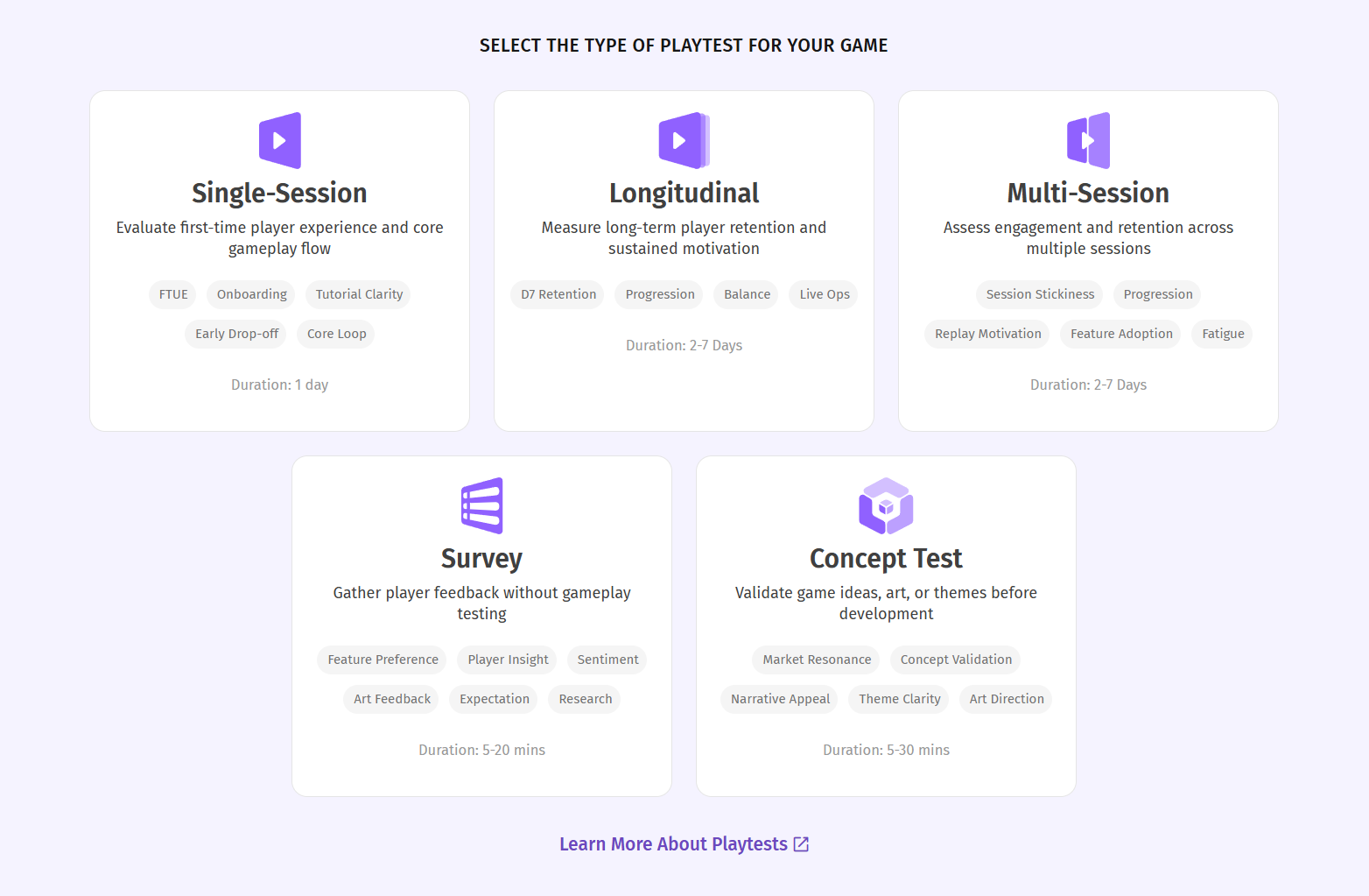 • Days and Daily Playtime (only for Longitudinal): Define how many days playtesters should test the game and how long they should play each day.